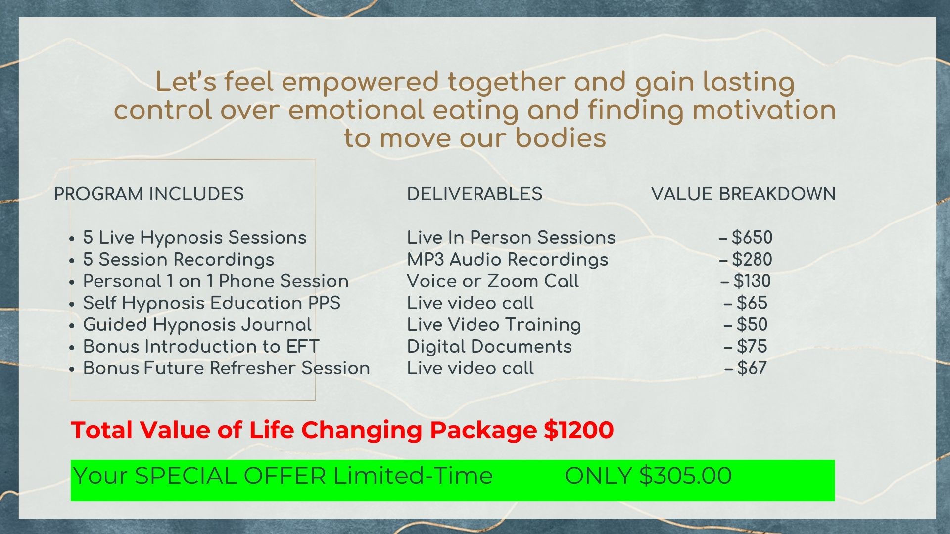 I offer a free initial consultation to discuss your specific concerns and goals, and address any questions you may have. This will help you (and me) gauge if hypnosis aligns with your specific needs.